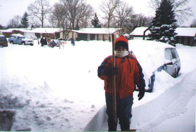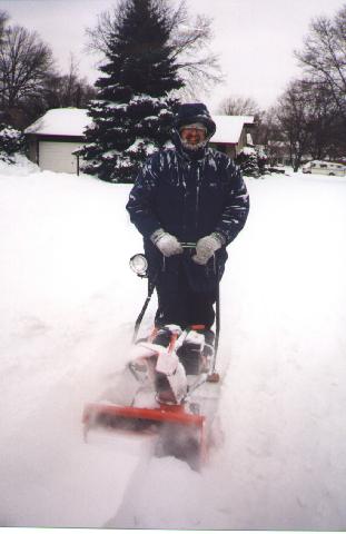 Ted is helping clear out the snowdrift. In the background a group is trying to push our neighbors car into her driveway. She had to spend the night at work. That's me heading toward mailbox with the snowblower to help out.