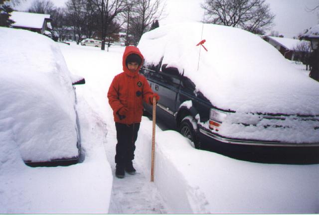 Patrick is measuring how deep the snow is. Somewhere between 18" and 2 feet in most parts.