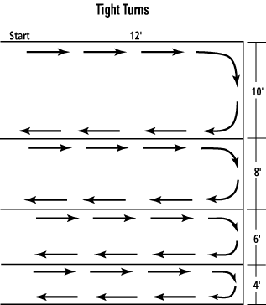 Instructions: Rider starts before lines being and then rides between the lines to the end without crossing the lines. The narrowing of the lines requires the rider to steer straight and forces them to be more controlled in riding.